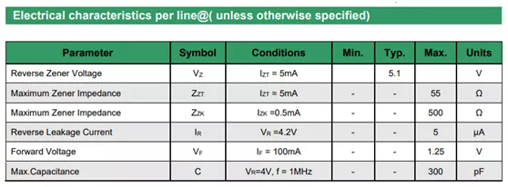 Ir@Vr:反向漏電流,指在特定的反向電壓下測試得到的電流,從SPEC上看,Vr=4.2V時,Ir=5uA,這個電流很重要,穩壓管沒進穩壓狀態也就是沒工作時消耗的電流,Ir越小越好。